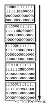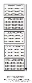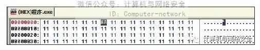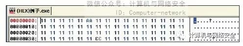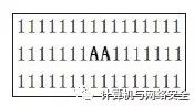 为了更加直观地介绍各个特征码定位器的原理,制作了一个极其简单的例子程序,如图5所示。当然这个程序是不能运行的,只是为了演示所用。这个程序中的"1111……"代表的是有数据的地方,其中的"AA"就是我们假定的特征码。