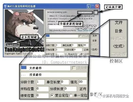 为了让您更直观地了解特征码定位技巧,下面以脚本木马的特征码定位为例进行讲解,因为它相对更容易理解。俗话说“磨刀不误砍柴工”,下面先为您介绍一下MyCCL特征码定位器这个工具,相信会对大家日后的深入研究与自学有帮助。打开MyCCL程序后的界面如图22所示。为了便于理解,我将MyCCL分为“参数区”与“控制区”来进行讲解。