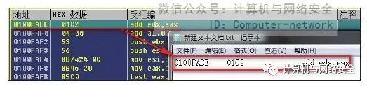 1)按快捷键Ctrl+G调出“跟随表达式”对话框,并输入转换出来的内存地址"0x0100FAEE",然后用鼠标单击地址"0x0100FAEE"处的汇编指令,按快捷键Ctrl+C复制,并保存在记事本中,如图41所示。