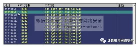 2)找到如图42所示的一处空白区域,并记住其中的任意一个地址,这里选择的是"0x0101865E"这个地址。