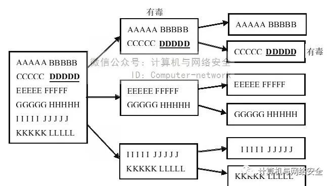 而将文件数设为3时,则会出现如图34所示的流程,可见受其特征码位置的影响,定位出来的精度为1/3的文件长度,而后即便使用了粗略的复合定位法,特征码的长度仍然是整个文件的1/6。可以发现,文件数设为3时生成的文件个数虽然只比设为2时多了1个,但是在这种特殊情况下,特征码的精度却提高了3倍!那么如果将生成样本数设为6个呢?经过计算,特征码的精度与分为3个相比,其精度提高了2倍。