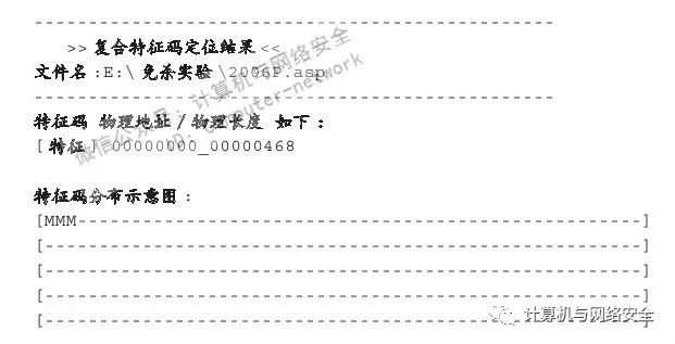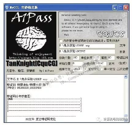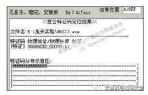 因此,第一次完全可以少生成一些,例如先定位出500字节的特征码,由于文件的绝大部分区域不含有特征码,所以在二次复合定位时完全可以把那些不含特征码的区域忽略掉,这样一来就可以在极小的区域内查找特征码了。如果就像上面所说的,第一次定位出500字节精度的特征码,那么进行第二次符合定位时,只需生成250个特征码样本即可完成特征码的查找工作。这样一来总共生成的文件不超过2000个,效率一下提高了200多倍。