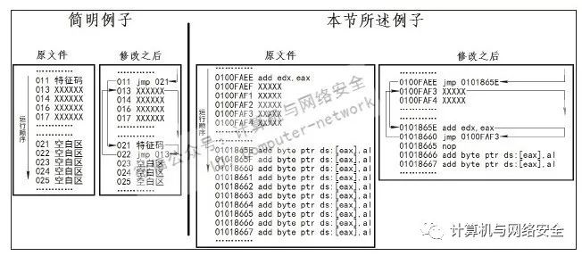 看了上面的操作,不知道您是否会有这样的疑问:这样跳来跳去的究竟是要达到什么目的呢?其实这是利用杀毒软件特征码查杀的弊端所创建的一种修改方法。我们知道,特征码的定位是有一个偏移量地址的,而这样更改之后在原来那个偏移地址里的内容就变成了跳转指令,原来的指令则被移动到了另外一个位置,所以杀毒软件自然也就不报毒了。而且由于那两个跳转的存在,所以整个程序仍然是连贯的,整体修改思路如图47所示。对此还不太明白的朋友可以根据这幅插图进一步理解一下。