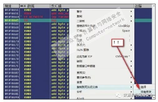 6)将"0x0101865E"下面那条空指令汇编为jmp 0100FAF3。最后在这个窗口的任意区域单击右键,依次选择“复制到可执行文件”→“所有修改”,如图46所示。在弹出的对话框中单击“全部复制”按钮,然后在新界面中单击右键,并选择“保存文件”即可。