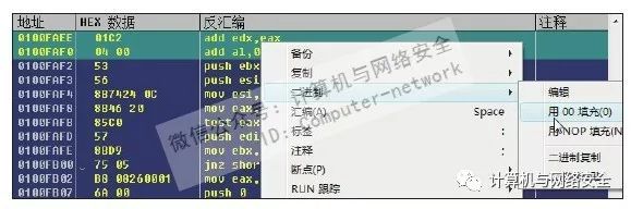 3)返回"0x0100FAEE"处,右键单击这句指令,在弹出的对话框中依次选择“二进制”→“用NOP填充”,如图43所示。然后再以同样的方式将地址"0x0100FAF0"与"0x0100FAF2"的内容也用NOP填充(在操作之前将位于这两个地址后面的汇编指令保存在记事本里)。