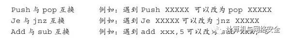 上面3条指令的应用方法非常简单,就是一个替换的问题。我们重点讲解一下“Add与sub互换”。Add与sub在汇编里分别是加与减的意思,例如add xxx,5就是将"xxx"加上5的意思,很显然,sub xxx,-5则是将"xxx"减去-5的意思。但是我们仔细地想一想,加5与减去-5在结果上有何不同呢?很显然它们取得的结果是一样的啊!既然取得的结果一样,自然也就不会对程序的运行产生影响了,因此就可以利用这个原理来将这两个指令调换着使用。但是需要注意的是,这里加减运算所应用的都是十六进制数据。