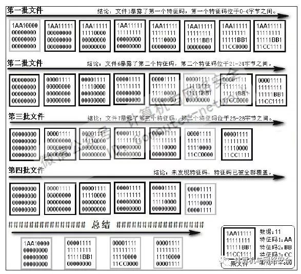 特征码的混合定位一般是应用二分法或逐块暴露法定位出含有特征码的较小区域,然后再采用逐位测试法探测出特征码的具体位置及长度。