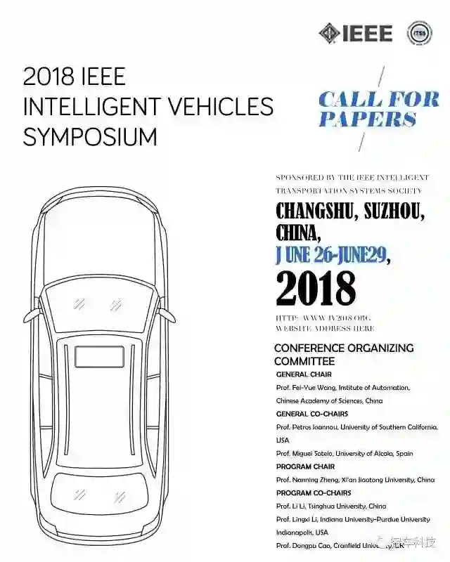 IV ' 18将于2018年6月27日至29日在中国苏州召开,中国科学院复杂系统管理与控制国家重点实验室主任王飞跃任大会主席,美国南加州大学先进交通技术中心主任、IEEE 智能交通系统汇刊主编Petros A. Ioannou教授与西班牙阿尔卡拉大学副校长、IEEE国际智能交通协会主席Miguel Ángel Sotelo教授任共同大会主席,自动化学会理事长郑南宁院士任大会程序主席,美国印第安那大学普渡大学印第安那波利斯分校(IUPUI)电子与计算机工程系车辆主动安全研究所智能汽车实验室主任李灵犀副教授、清华大学自动化系副教授李力、英国克兰菲尔德大学驾驶员认知与自动驾驶实验室主任曹东璞教授任共同程序主席。