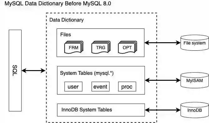 通过以上 mysql.tables 的表定义可以获得存储引擎中实际存储的元信息字段。DD tables 包括 tables、schemata、columns、column_type_elements、indexes、index_column_usage、foreign_keys、foreign_key_column_usage、table_partitions、table_partition_values、index_partitions、triggers、check_constraints、view_table_usage、view_routine_usage 等。