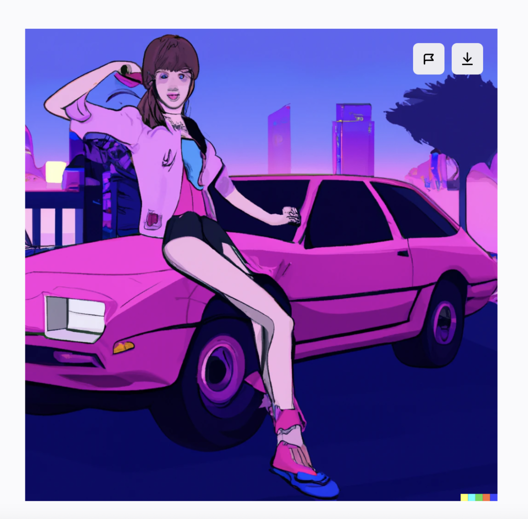 谈到艺术形式,Dall-E是如何处理纯 "艺术绘画 "的?我试图用Dall-E重现我做过一幅插图,没有啥专业要求,只是自娱自乐。因为这样就没有那么多动机去 "精确"(因为不需要专业的)。只是想看看Dall-E是否比专业故事板更适合于艺术。下图是我自己设计的图片(我是Vaporwave和lofi美学的超级粉丝,在Instagram平台上绘制了很多那种80年代的图片,还把它们做成了动画):