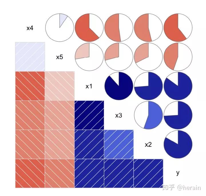 > corrgram(example10_1[2:7], order=T, lower.panel=panel.shade,upper.panel=panel.pie,text=panel.txt)解读相关系数矩阵图,请参考搜索,获取了解。蓝色表示正相关,红色表示负相关,对应颜色的饼图表示相关的度。