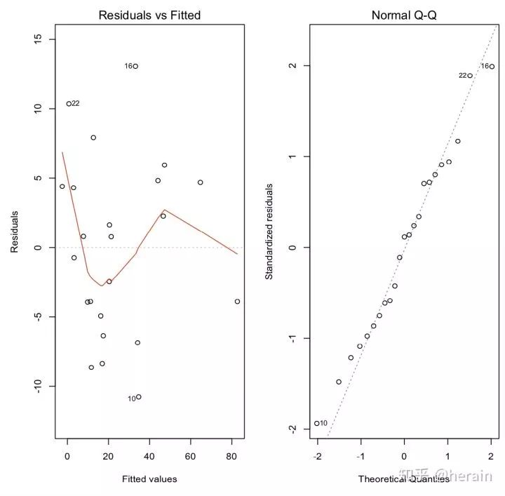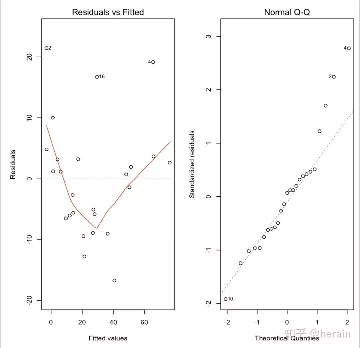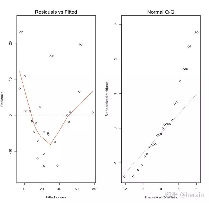 > plot(fit1,which=2)在图中发现点2,4,16具有较大残差,残差的正态性存在问题(可以考虑重建模型,或者剔除较大残差值),如下我们剔除点 2,4 重新建立回归模型: