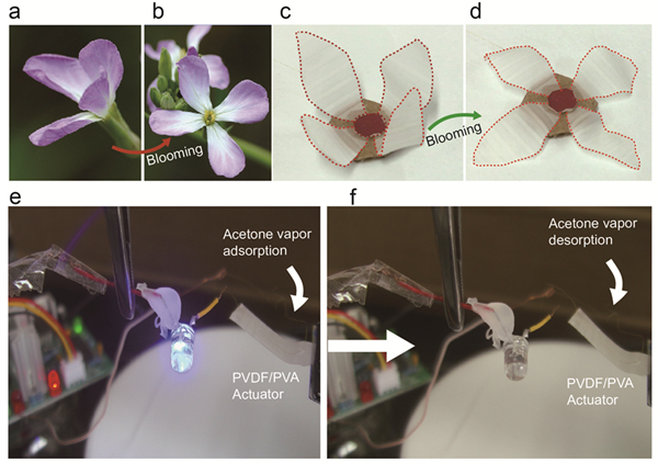 聚偏氟乙烯/聚乙烯醇双层膜的仿生形变。花瓣形状的双层膜吸收丙酮分子产生像萝卜花一样的形变运动。利用此种仿生运动设计的薄膜传感器,可以长时间连续监测环境中丙酮浓度。当环境中丙酮浓度过高时,传感器自发形变接通电路,电灯亮。当丙酮浓度逐渐降低时,传感器恢复到原来形状断开电路,电灯灭,从而利用电灯的变化来告知环境中丙酮蒸汽浓度的高低。