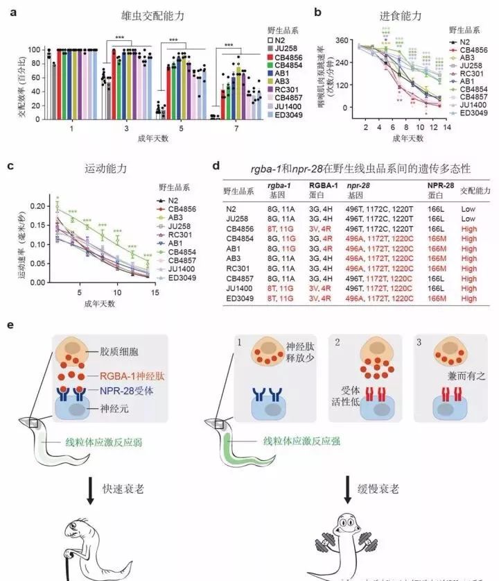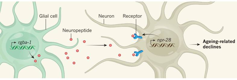 研究者发现,线虫(Caenorhabditis elegans)神经胶质细胞rgba-1基因产物会产生4种不同类型的神经多肽,其从胶质细胞中释放出去,与由神经元细胞基因npr-28表达的受体结合起来,进而调控线虫的衰老速度。主要体现在如下几个指标:生殖、摄食、运动能力的下降。RGBA-1神经肽会激活多巴胺能神经元和血清素能神经元上的NPR-28受体,加速细胞衰老。这条信号通路还可减少线粒体非折叠蛋白反应(UPRmt)激活,具体是通过SIR-2.1通路,加速细胞的衰老。