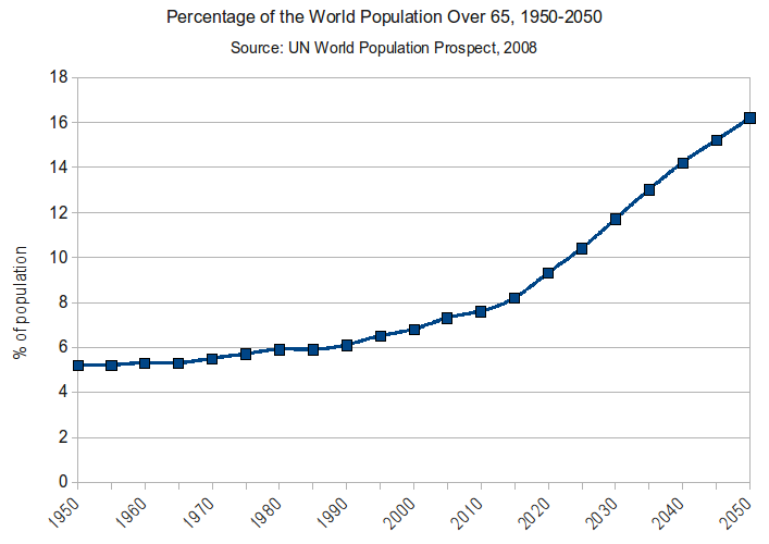 ► 全球超过65岁的老人比例,迅速攀升,图片来自wikipedia