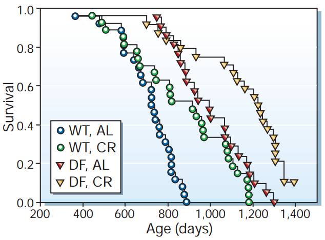 ► 长寿基因和饮食对小鼠寿命的影响,图片来自nature