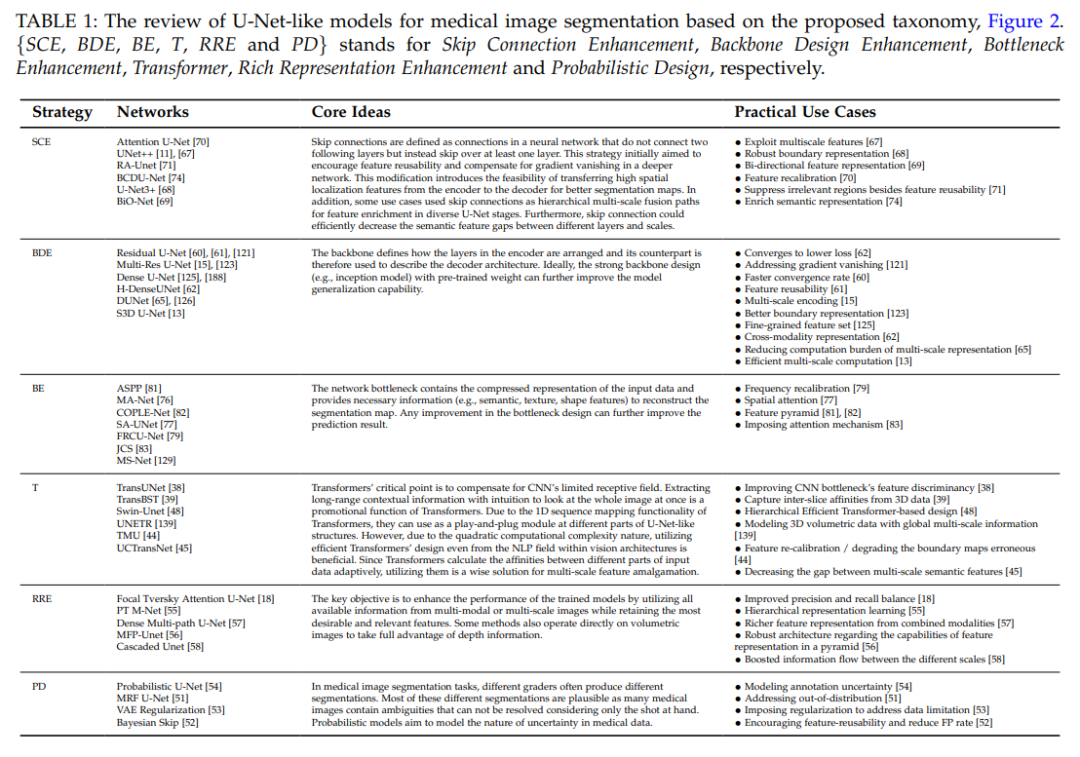 U-Net是一个无处不在的网络,它在2015年首次发布时被引用了大约4.8万次。这证明它可以处理广泛领域的各种图像模式,而不仅仅是在医学领域。在我们看来,U-Net的核心优势是它的模块化和对称设计,这使得它适合广泛修改和与各种即插即用模块协作以提高性能。因此,通过追求这一线索,我们侵犯了Ronneberger等人的[7]网络,除了坚实的辅助修改外,还可以实现模块化改进的对等体,以实现SOTA或与分割性能相当的性能。在这方面,我们提供了我们的分类法(图2),并将UNet修改的各种变体划分为如下的系统类别: