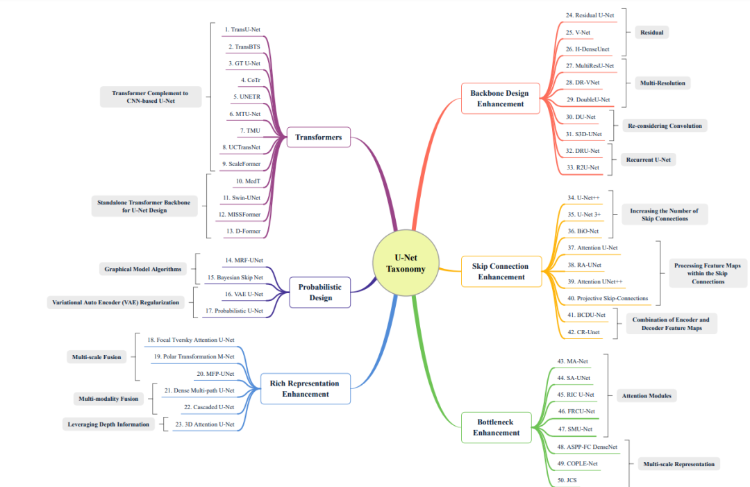 我们的综述涵盖了最新的基于U-Net的医学图像分割文献,并讨论了截至2022年9月提出的100多种方法。我们对这些方法的不同方面进行了广泛的回顾和阐述,包括关于普通U-Net的网络架构增强、医疗图像数据模式、损失函数、评估指标及其关键贡献。根据UNet及其变体的快速发展,我们提出了在我们的分类法中被频繁引用的方法的总结。我们将U-Net变体分为以下几类: