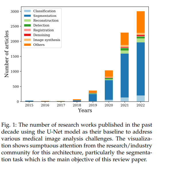 U-Net的自动编码器设计使其成为在重要应用中打破其结构的独特工具,例如,图像合成[28],[29],[30],图像去噪[31],[32],[33],图像重建[34],[35]和图像超分辨率[36]。为了更好地了解U-Net模型在医疗领域的重要性,我们提供了图1,关于在处理医疗图像分析挑战时使用U-Net模型的方法的统计信息。从图1中可以明显看出,U-Net影响了医学图像分析领域的大多数不同分割任务,在过去十年中出版物数量的极端增长。