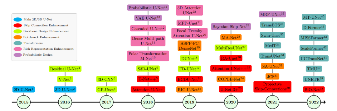 图 2015 - 2022年医学语义分割文献中提出的基于U-Net的主要方法的时间轴。