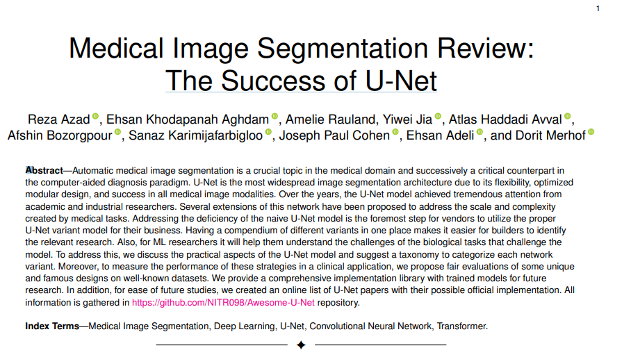 医学图像自动分割是医学领域的一个重要课题,也是计算机辅助诊断领域的一个重要分支。U-Net由于其灵活性、优化的模块化设计和在所有医学图像模式中的成功,是最广泛应用的图像分割体系结构。多年来,U-Net模式获得了学术界和工业界的广泛关注。来自德国亚琛工业大学等学者《医学图像分割》综述,详述六大类100多个算法,非常值得关注!