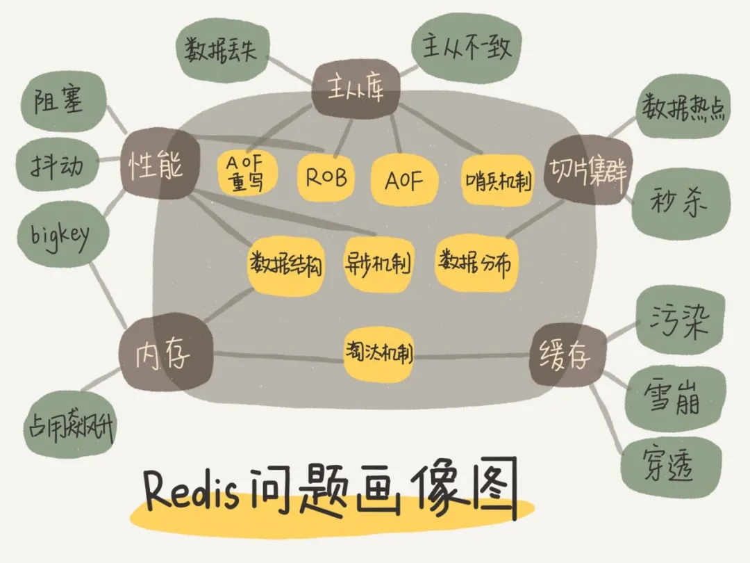 这里,分享给你一张 Redis 问题画像图,帮你快速定位问题对应的 Redis 主线模块,及相关技术点。举个例子,如果 Redis 响应变慢,对照下图你就会发现,这个问题与 Redis 性能主线相关,而性能主线又和数据结构、异步机制、RDB、AOF 重写相关,找到了影响因素,解决起来就容易多了。