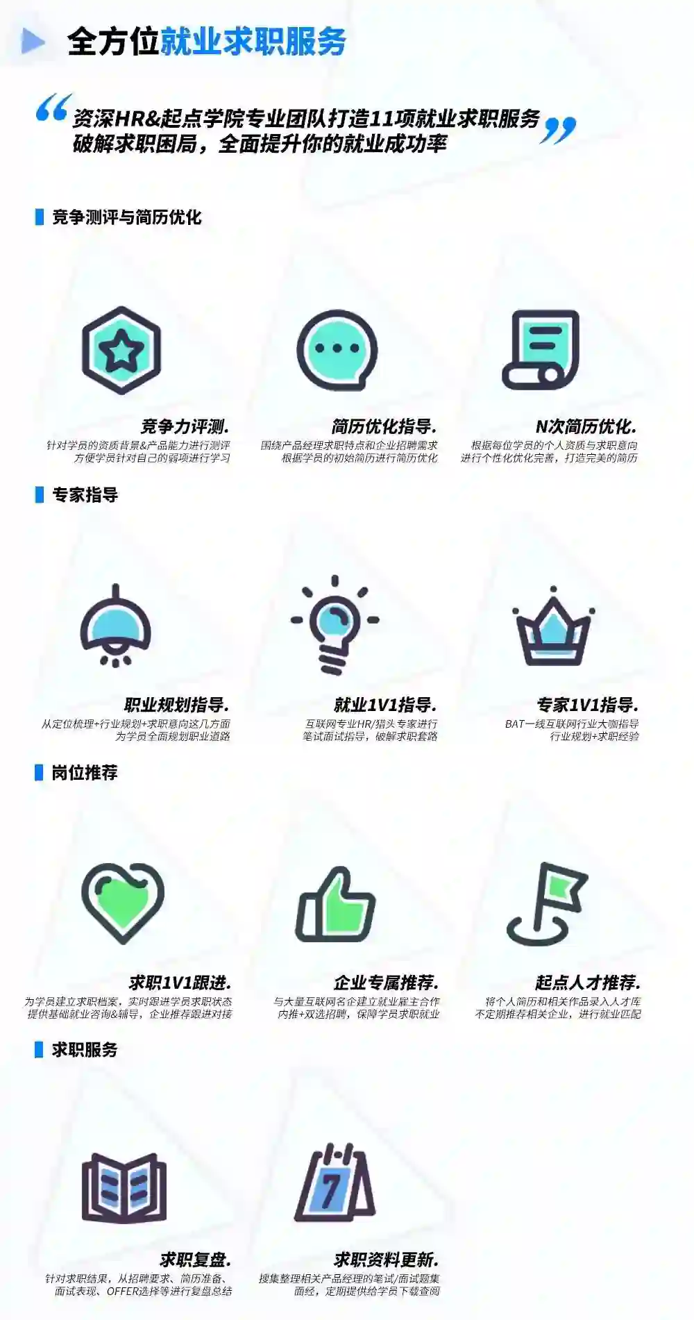 因此,特训营另一个特色在于“就业”,联合互联网名企资源,基于企业招聘需求提供11项求职就业服务,由就业服务老师、招聘管家全程为你支招,知己知彼打有准备的仗。