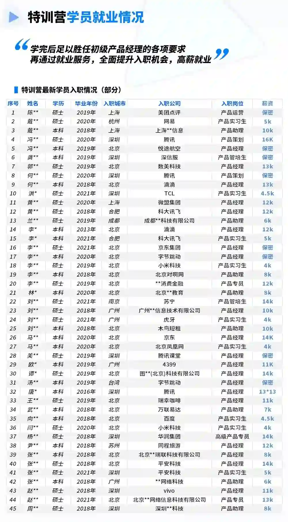 是的,以上的学员故事是来自产品经理就业特训营的优秀毕业生,在过去的日子里,除了TA们之外,特训营还帮助了许多同学拿到心仪offer。