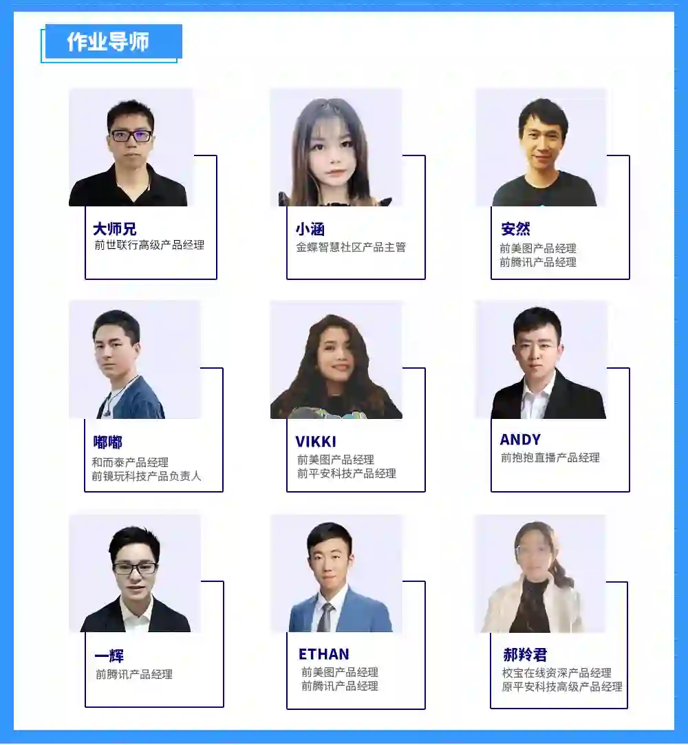 他们会为你带来比其他课程更多、更优质的教学服务——通过200+录播课、N次社群聊一聊、20+直播课、7次作业答疑、4次方向指导、1-6次1V1咨询等服务,将成熟的思维&方法论深入浅出地传授给你。