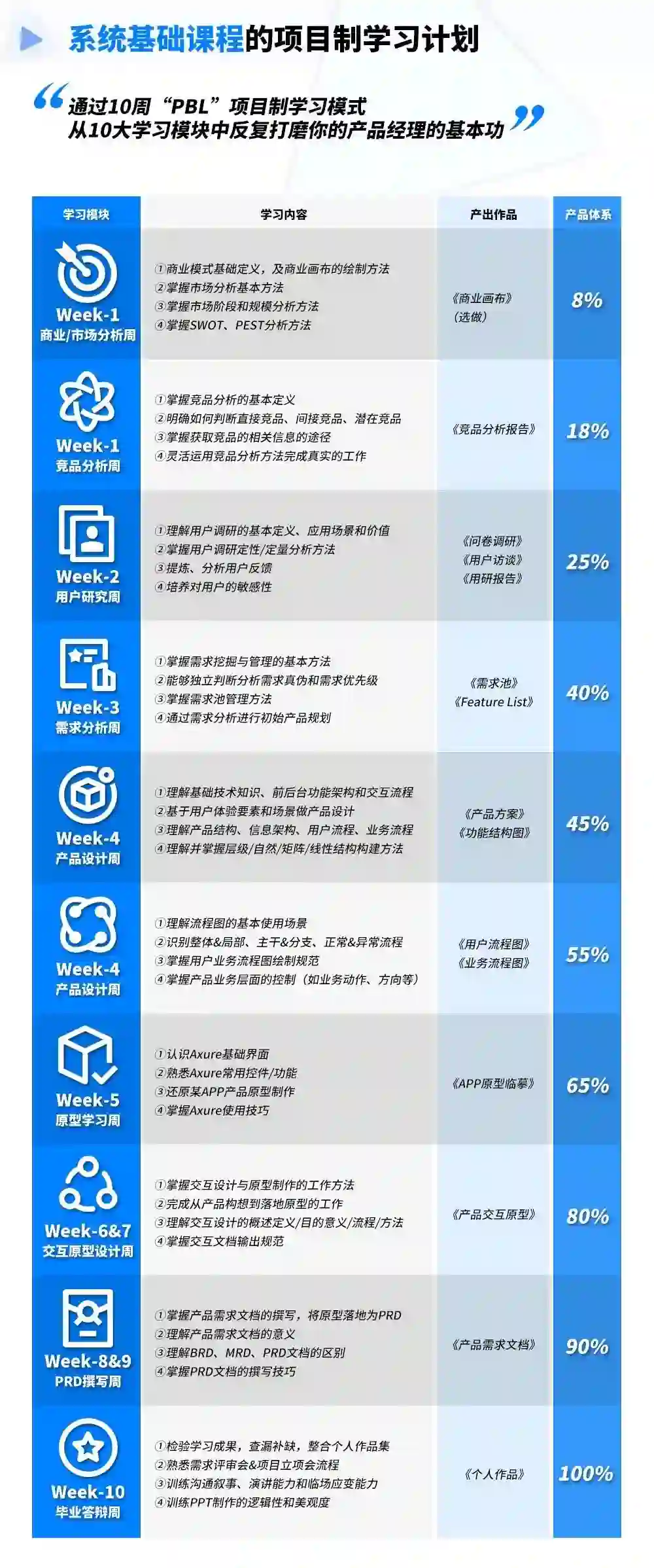 每一周你都会通过“大量刻意练习+输出倒逼输入”精细化学习一个产品模块的方法论,10周帮你建立体系化产品基础,对标初级产品经理岗位需求。
