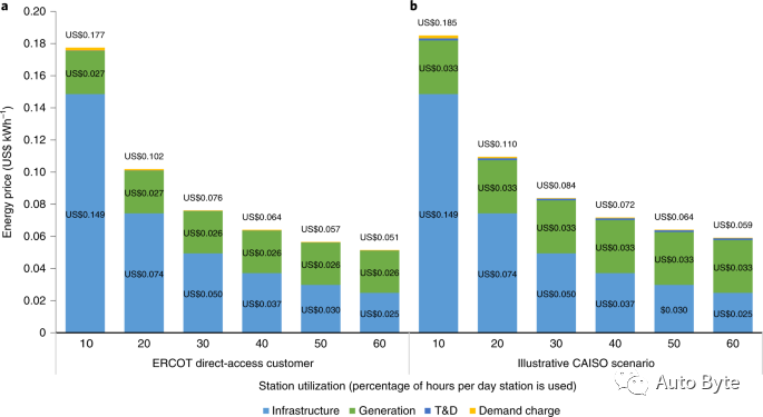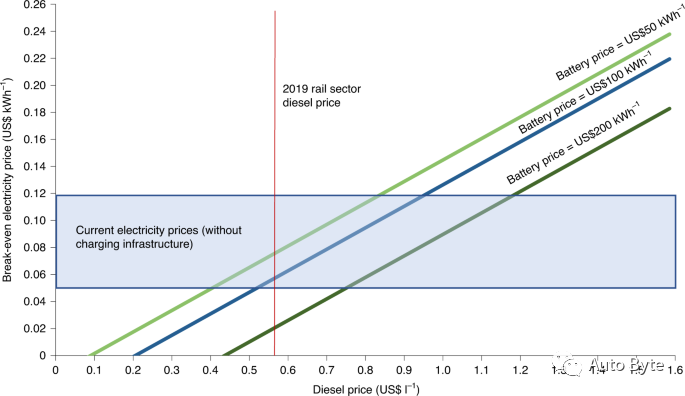 计算表明,为了与美国平均柴油价格(US $0.66/L)持平,电价必须达到US$ 0.072/kWh,电池成本必须低于US$ 100/kWh电池。而美国的平均工业电价为