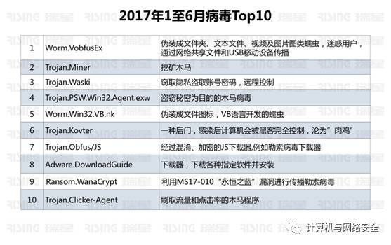 根据病毒感染人数、变种数量和代表性进行综合评估,瑞星评选出了2017年1至6月病毒Top10: