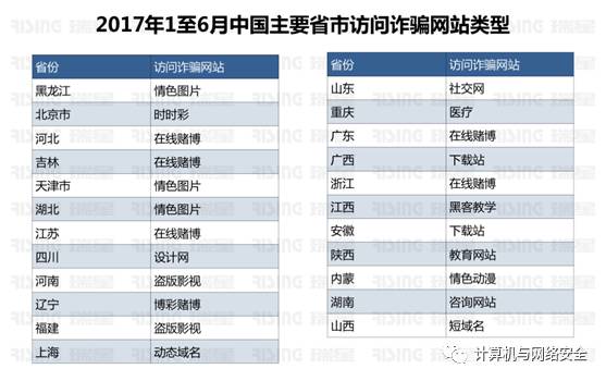 报告期内,北京市、河北省等访问的诈骗网站类型主要以网络赌博为主,而黑龙江省、天津市则以色情论坛为主。