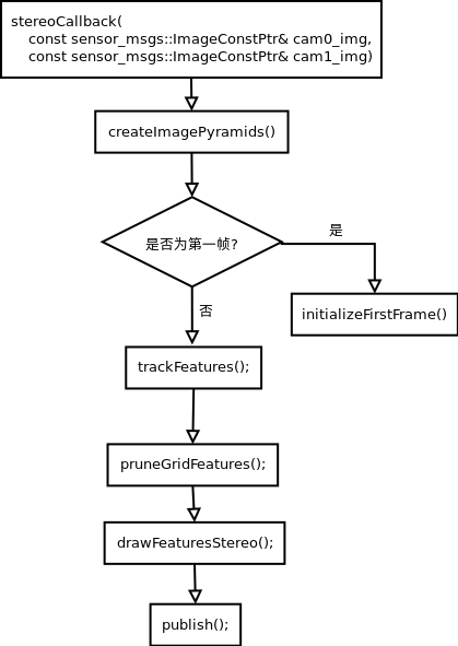当第一帧初始化完成之后,后面帧则只需要进行跟踪第一帧的特征点,并且提取新的特征点,整个流程如下: