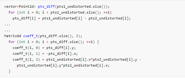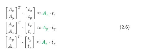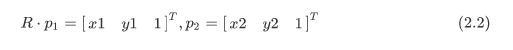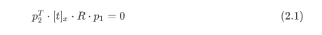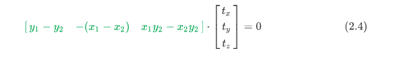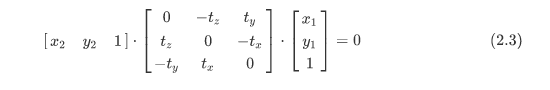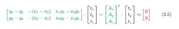 至于这个模型是怎么选出来的呢? 假设一共有N个inliers点对,那么根据式(2.4)势必会得到一个N*3 * 3*1 = N(0)的等式.但事实上由于误差和outliers的存在,最终结果不可能为零,我们取两个点将式子分块,并且只考虑两个点的情况,那么将会有: