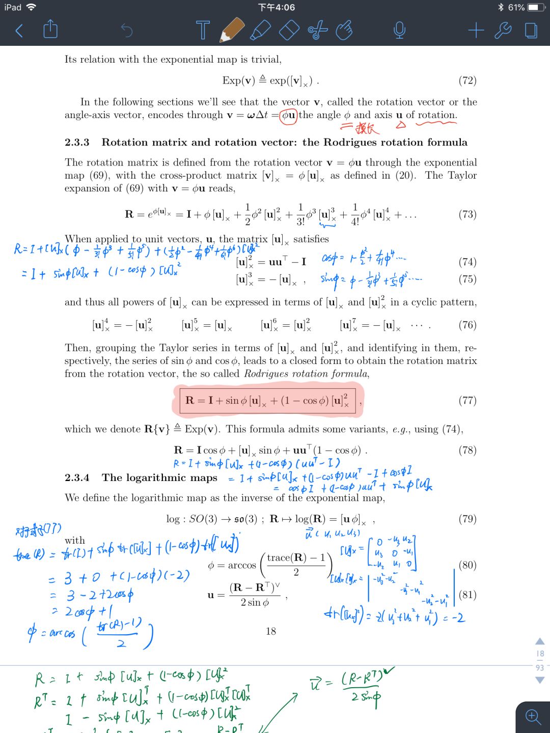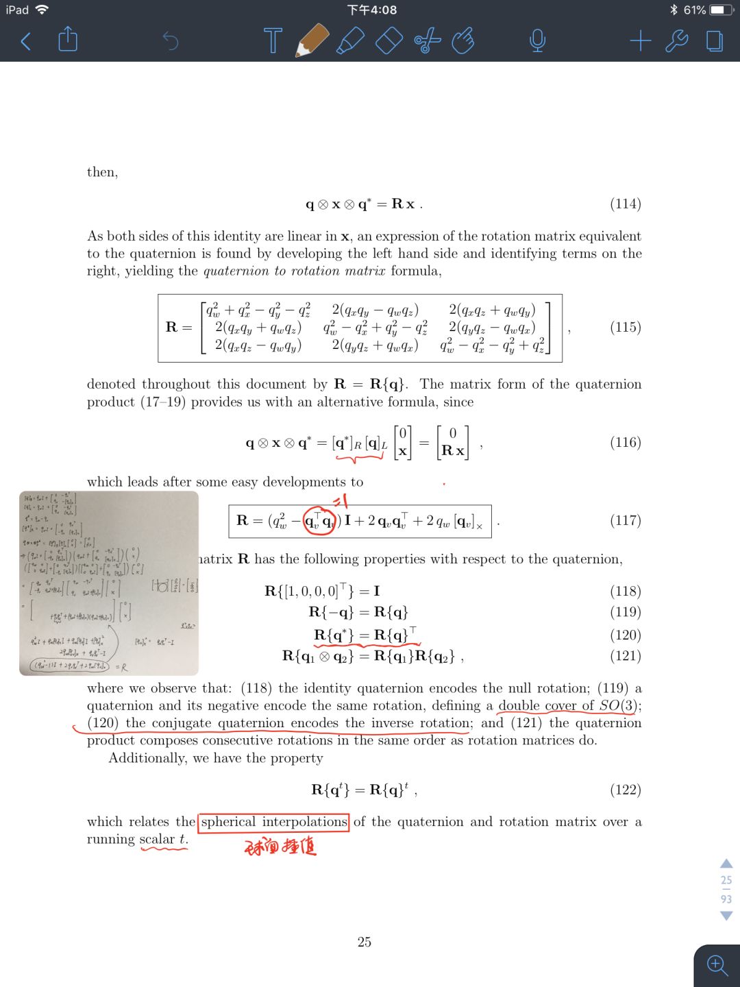 其实原理部分相当重要,包括你对error-state Kalman Filter的理解,但是如果要从头讲起的话可以说篇幅太长,考虑到做SLAM的同学们基本上都应该知道这本书 Quaternion kinematics for the error-state Kalman filter, 这本书会让你在四元数,SO3,IMU的模型以及基于IMU的ESKF(error-state Kalman Filter)都会有比较深刻的理解,对应这本书我也做了很多注释,关于基于四元数原理部分由于篇幅限制,我这里不想做太多的说明,但是接下来在讲解S-MSCKF原理部分我们会将参考公式附上.下面是一些我在这本参考资料中的注释图.
