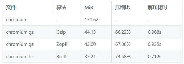 Gzip 、Zopfli 和 Brotli 是三种开源的压缩算法,对于一个 130M 的 chromium 文件,分别采用这三种压缩算法最大 level 的压缩效果是