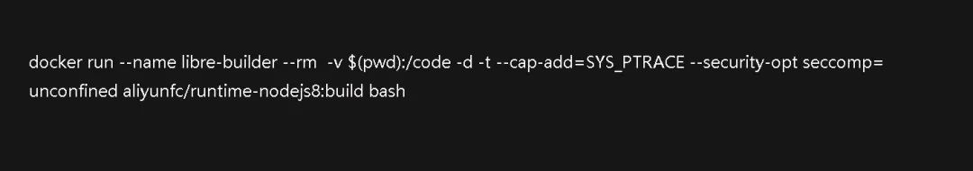 我们会采用 fc-docker 提供的 aliyunfc/runtime-nodejs8:build docker 镜像进行编译。fc-docker 提供了一系列的 docker 镜像,这些 docker 镜像环境非常接近函数计算的真实环境。因为我们打算把 libreoffice 跑在 nodejs8 环境中,所以我们选用了 aliyunfc/runtime-nodejs8:build,build 标签镜像相比于其他镜像会多一些构建需要的基础包。