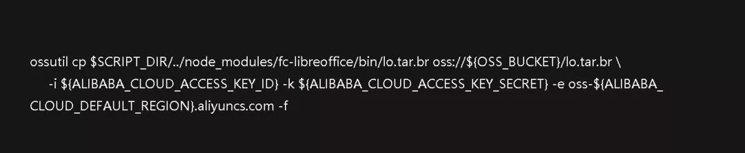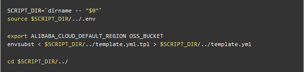 真实场景下,把秘钥和一起变量写在 template.yml 里并不合适。为了做到代码和配置相分离,上面使用了变量占位符 ${ALIBABA_CLOUD_DEFAULT_REGION} 和 ${OSS_BUCKET} 。