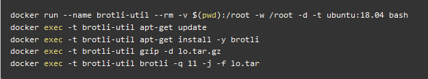 由于 aliyunfc/runtime-nodejs8:build 是基于 debain jessie 发行版的。在 debain jessie 上安装 brotli 较为麻烦,所以我们借助 ubuntu 容器安装 brotli 工具,将 tar.gz 格式转为 tar.br 格式。