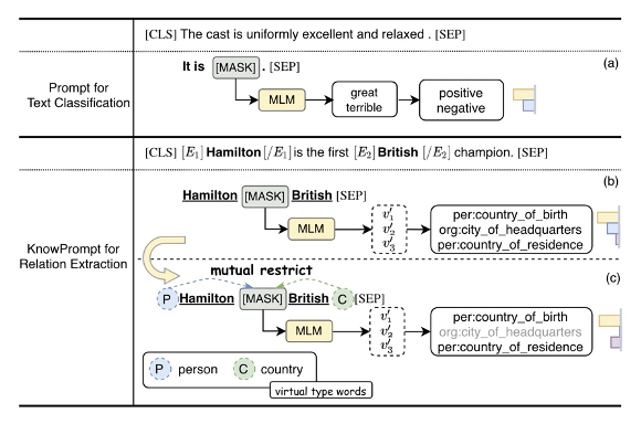 提示学习在具体的任务中面临诸多挑战。以关系抽取(RE)为例,如下图所示:一方面,为关系抽取构建合适的提示模板需要专业的领域知识,且模板需要大量的验证集进行验证,成本高昂;另一方面当关系抽取的标签的个数发生变化时,标签词搜索过程的计算复杂度非常高(通常与类别个数呈指数关联),因此较难在语言模型词汇表中针对特定的关系标签获得合适的标签词。我们观察到,关系标签之间存在丰富的语义知识,即关系三元组之间存在结构约束。例如,如果一对实体包含“person”和“country”的类型,则[MASK]在关系“org:city_of_headquarters”上的预测概率会相对较低。此外,关系也约束它的实体的类型。