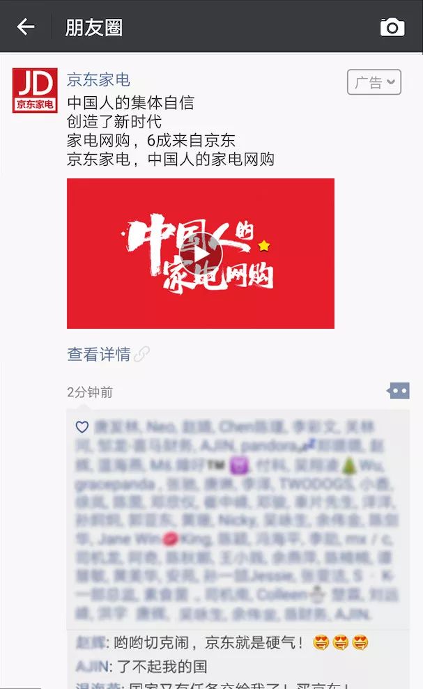 从昨天起,京东家电的“双十一”朋友圈广告打响了本年度网购拼杀的第一炮,全屏洋溢着的中国红,描述的前景,令人瞩目的数字, 给中国人打了一管振奋人心的鸡血。