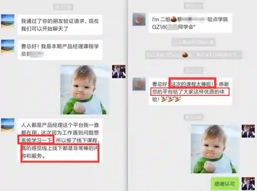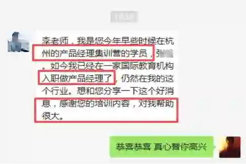 比如:产品实战营杭州站课程结束后,学员基于所学内容,顺利找到产品工作,仍然跟老师保持沟通交流。