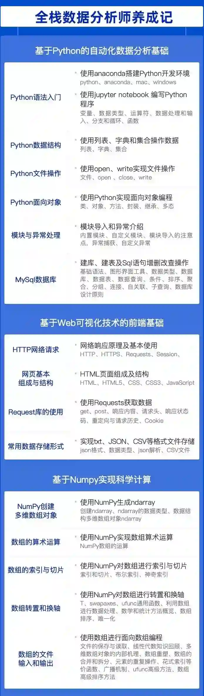 行业专家结合行业人才画像设计课程体系,内容全面且为学员制定专业的学习路径,培养复合型专业大数据分析人才。