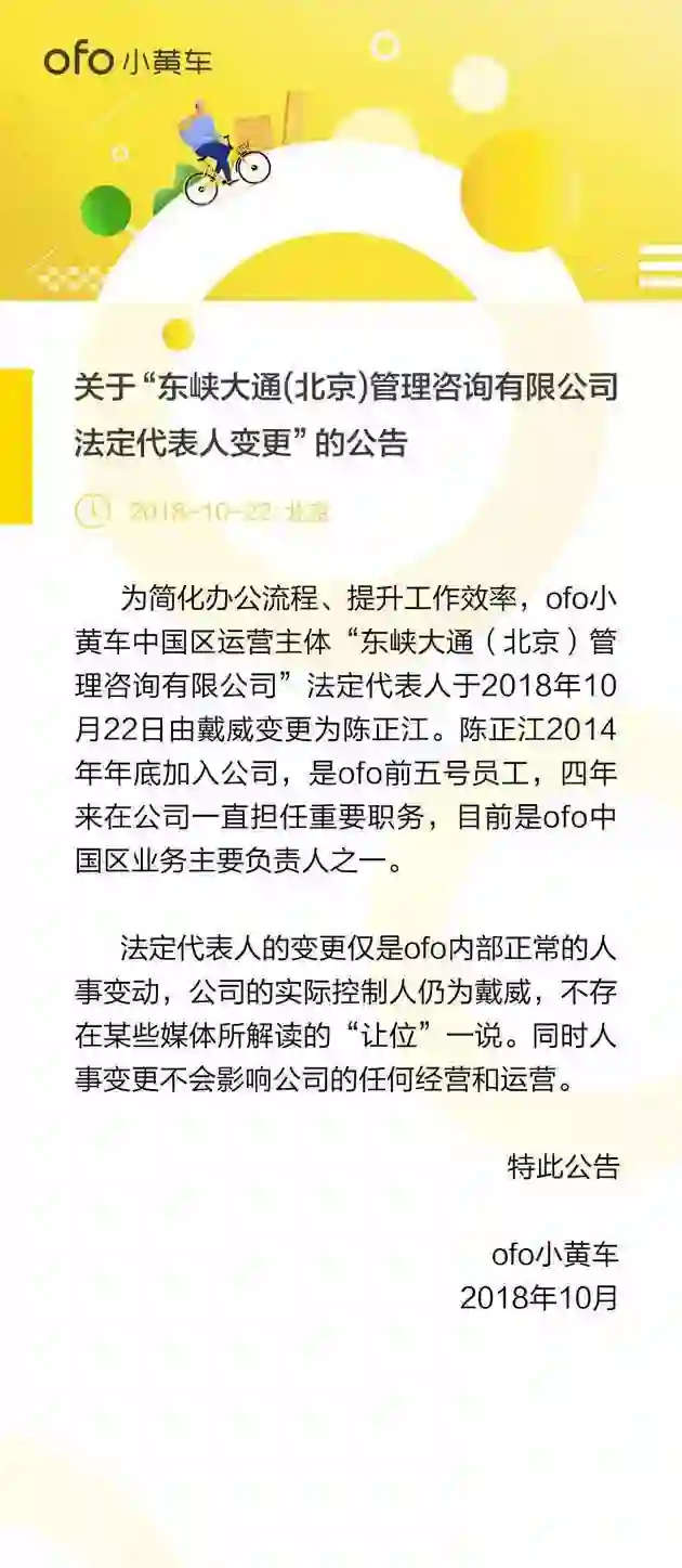ofo发布公告称,为简化办公流程、提升工作效率,ofo小黄车中国区运营主体“东峡大通(北京)管理咨询有限公司”法定代表人于今日由戴威变更为陈正江。法定代表人的变更仅是ofo内部正常的人事变动,公司的实际控制人仍为戴威,不存在某些媒体所解读的“让位”一说。同时人事变更不会影响公司的任何经营和运营。