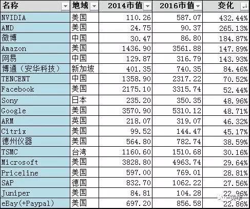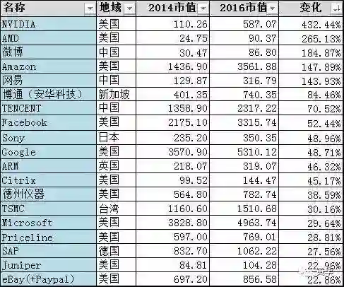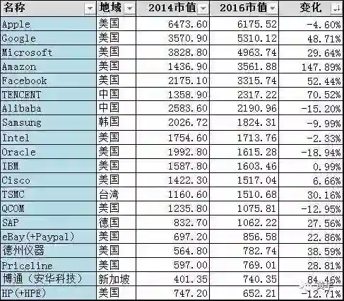 TOP20里面,8家互联网公司,8家半导体公司,占据了主要位置。传统大的IT公司占据了另外4席。