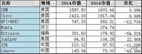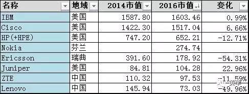 IBM其实并不是那么硬了,2016年总收入79.9B$,其中硬件收入仅5.9B$,不足十分之一,很难说是一家硬件公司,放在这里比不一定合适。IBM这两年的云化、智能化的转型,同时以杀鸡取卵的方式确保利润,总算取悦了华尔街,保住了市值。思科通过ODL打败了一批SDN的小厂家后,并且积极的做云化转身,华尔街没有继续大幅度看空他,终究这是一个每年有100亿美金利润的公司,不可能太便宜。