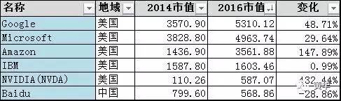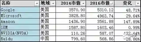 又是清一色的美国公司,百度勉强挤在里面。英伟达的市值2年增加了5倍,可以想象现在的人工智能有多火。AI这个产业是从2015年被点燃的,各大IT公司纷纷布局,现在也很难用数据来佐证这个趋势。这两年, IBM猛炒Watson,Google大推AlphaGo围棋。但微软Azure和亚马逊AWS,不可能在大数据红火时袖手旁观。微软目前拥有适用数据分析的大规模存储库Data Lake等近10个数据存储和分析服务,Amazon AWS目前拥有Hadoop框架EMR等七款产品。