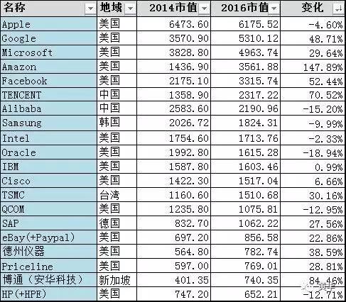 TOP20里有5家亚洲公司(中国3,韩国1,新加坡1),1家欧洲公司。在IT领域欧洲和日本公司已经渐行渐远。未来必然走向中美争霸的局面,这跟中美两国市场规模、人口基数有关。