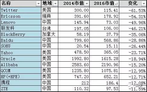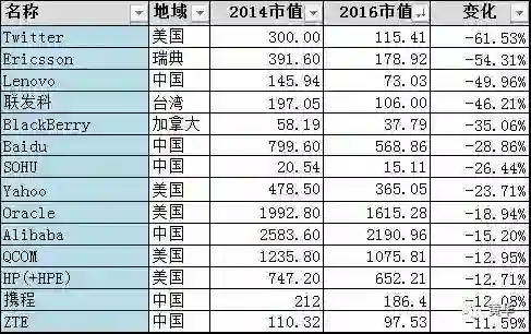 Twitter占据了快速滑落公司的榜首,年初Twitter的市值还是腾讯微博的几倍,但年中一度被微博反超。 Twitter受Instagram和Snapchat冲击太狠,腾讯微博没有这个问题。